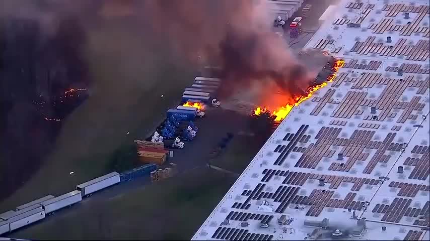 Thick smoke could be seen coming from a fire that burned for hours and damaged part of an insulation and manufacturing companys warehouse in New Jersey. Various of scene plume of rising smoke in the distance. DELANCO More than 7000 solar panels on the roof of a burning warehouse in Burlington County proved too much of a hazard for firefighters local officials.